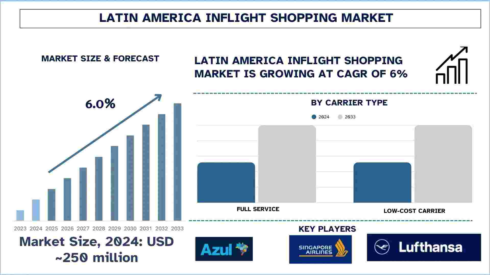 According to UnivDatos, increasing air travel alongside rising consumer disposable income are expected to increase demand for In-flight shopping. As per their “Latin America Inflight Shopping Market” report, the Latin American market was valued at USD 250 million in 2024, growing at a CAGR of about 6% during the forecast period from 2025 - 2033 to reach USD million by 2033.