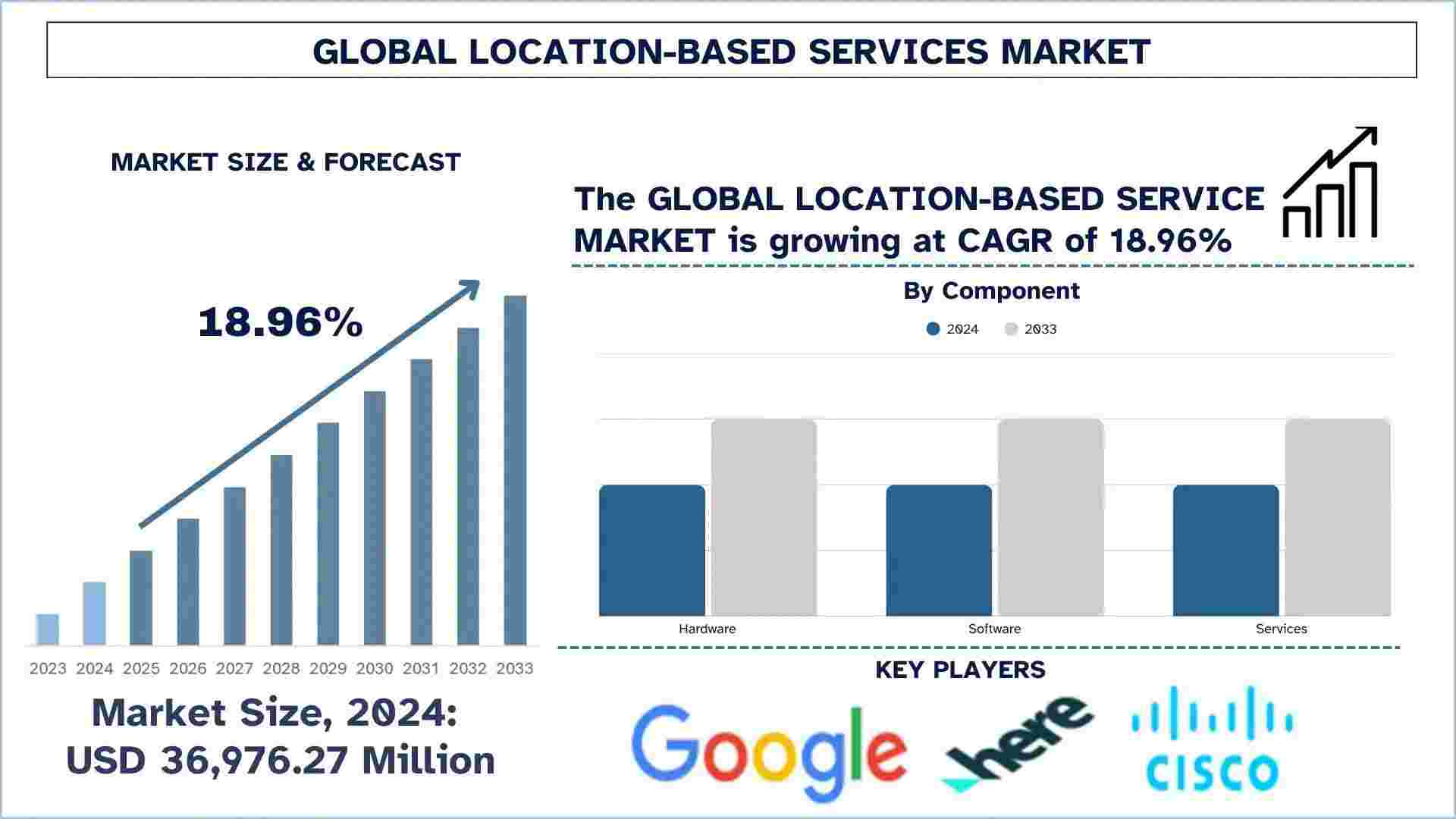 According to the UnivDatos, as per their “Location-Based Services Market” report, the global market was valued at USD 36,976.27 million in 2024, growing at a CAGR of about 18.96% during the forecast period from 2025 - 2033 to reach USD million by 2033.