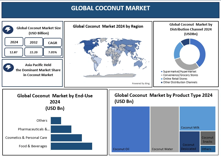 The global Coconut Market is witnessing steady expansion, driven by rising consumer awareness toward health, nutrition, and plant-based lifestyles. Coconut and its derivatives have become an important part of daily diets, beauty routines, and wellness applications across the world. With growing demand for natural ingredients, functional foods, and dairy-free alternatives, coconuts are increasingly used in food & beverages, cosmetics, pharmaceuticals, and personal care products. The market is supported by strong production in tropical regions and rising consumption in developed economies, where clean-label and organic food trends continue to gain traction.